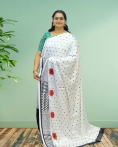Embrace classic charm with this White Ajrakh Print Grape Silk Saree. Featuring timeless polka dots, vibrant floral accents, and geometric borders, it offers a sophisticated look for any occasion.