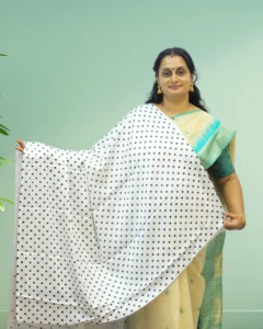 Ajrakh Printed White Grape Silk Saree with Polka Dots and Floral Border