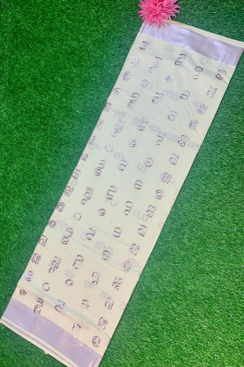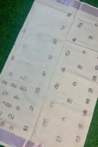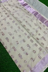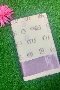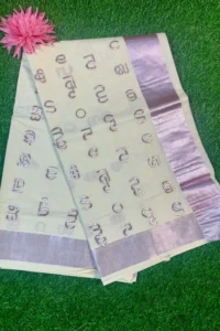 Woven with shimmering rose-gold tissue and elegant kasavu borders, the Aksharamala saree blends tradition with sophistication, perfect for festive occasions and graceful celebrations with timeless Kerala charm.
