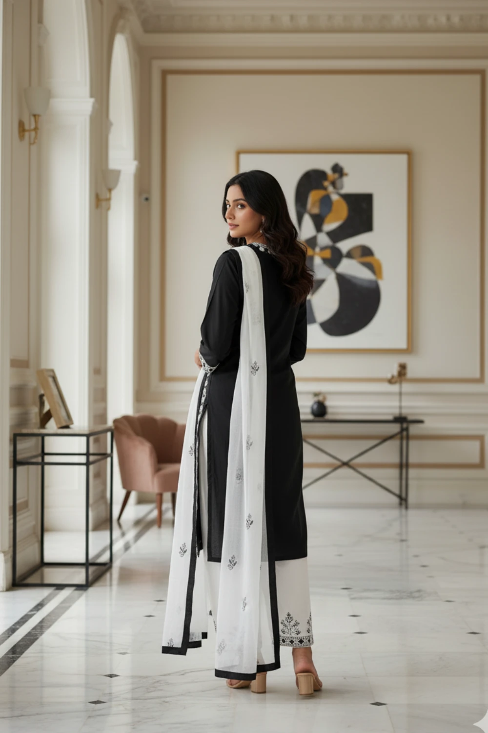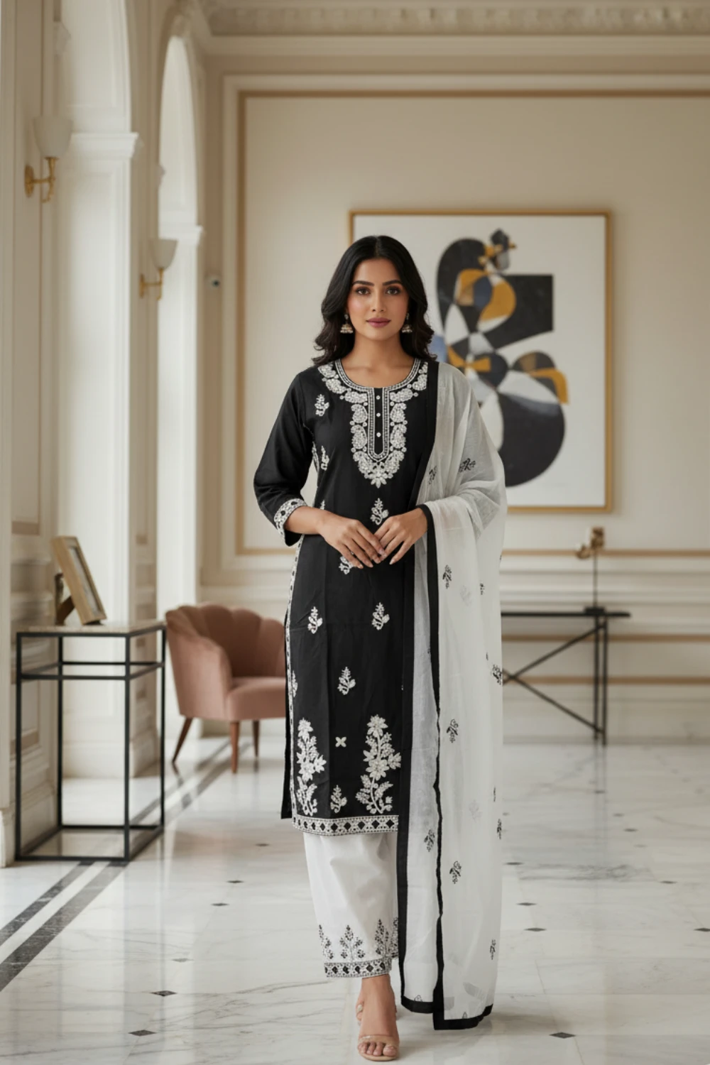 | Color | Kurta: Black; Embroidery: White; Dupatta: White with Black Border/Work |