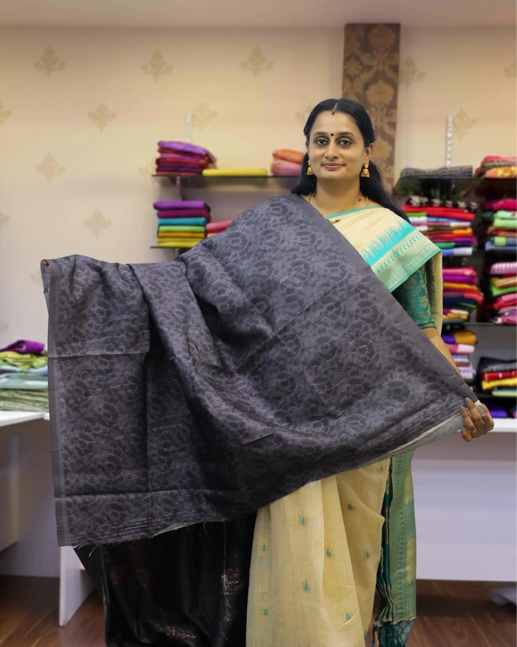 Charcoal Grey Tussar Kalamkari Printed Saree with Peacock Pallu