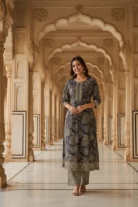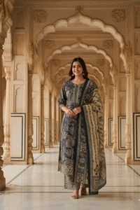 Elegant pure modal kurta set in a charcoal print, featuring fine embroidery and mirror detailing.