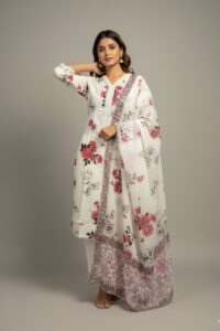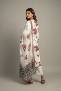 A crisp white cotton suit with a striking red floral print. It features intricate Croatian lace and mirror work, with a window lace detail on the kurti border and pants for an elegant finish.