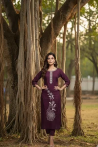 Luxurious pure Roman silk kurta set featuring detailed embroidery and an elegant pure Banarasi dupatta.
