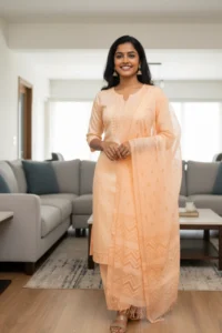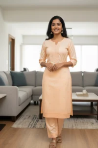Elegant, soft peach cotton blend kurta set with delicate tonal embroidery, perfect for a subtle daytime look.