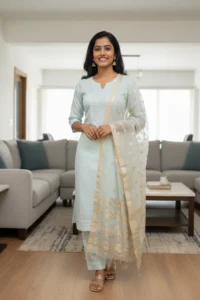 Style | Straight Kurta with 3/4 Sleeves, Coordinated Pants, and Dupatta |