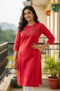 Vibrant red cotton blend kurta featuring intricate golden floral embroidery on the yoke for a festive look.