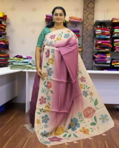 Exude artisanal charm in this Hand Work Matka Tussar Saree. Featuring a stunning mauve and cream ombre effect, it is beautifully detailed with vibrant floral embroidery and an elegant scalloped border.