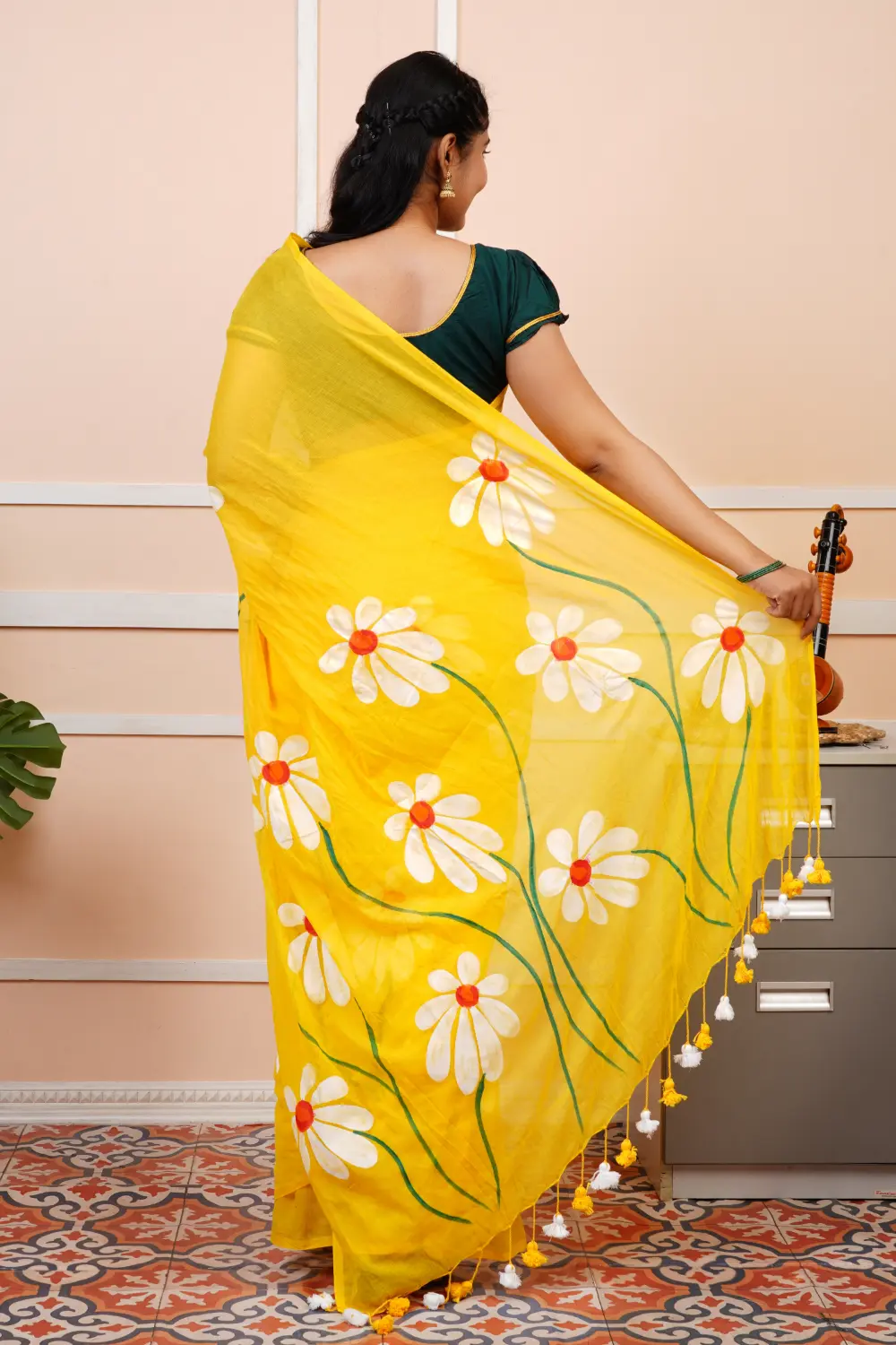 Silver Printed Jute Cotton Handloom Saree in Mustard Yellow with Black Blouse