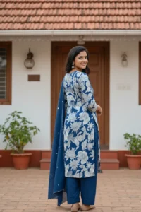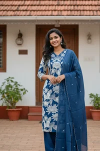 Comfortable Taj cotton A-line kurta featuring an indigo floral print with matching palazzo and dupatta.