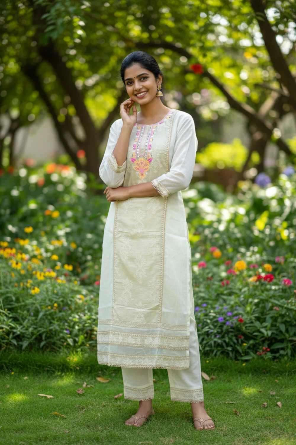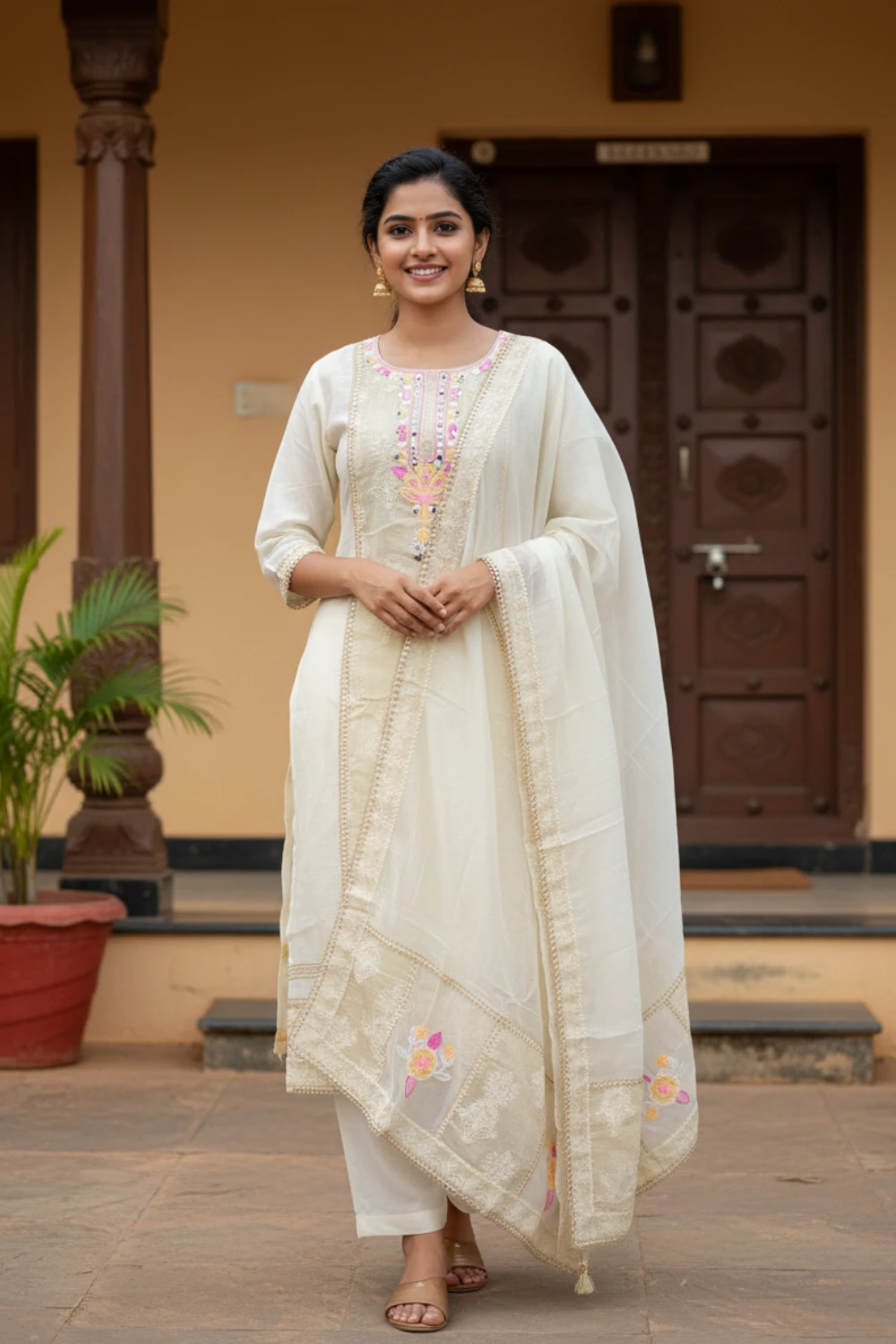 | Fabric (Kurta/Pants/Dupatta) | Likely Cotton Silk/Rayon Blend Kurta and Pants / Organza Dupatta |