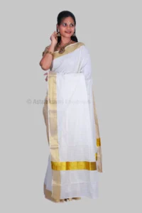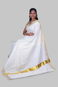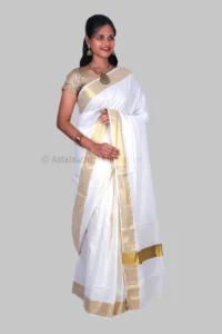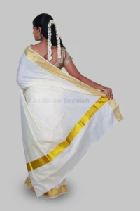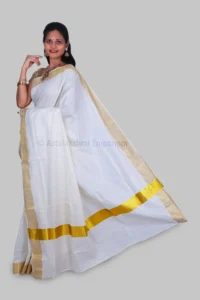 Elegant Kerala Kasavu saree crafted from pure cotton in classic cream, featuring rich golden borders, traditional weaving artistry, and unmatched comfort—perfect for festive occasions, weddings, and cultural celebrations.