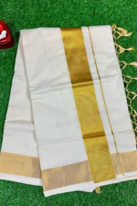 Elegant Kerala saree featuring a lustrous gold plain border, woven from soft cotton for comfort and tradition, ideal for weddings, festivals, and timeless cultural celebrations with understated sophistication.