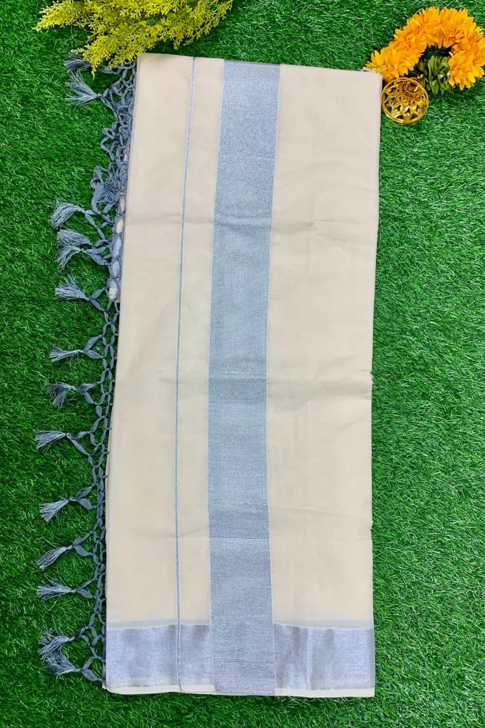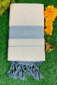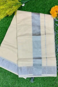 Elegant Kerala saree featuring a subtle gray plain border, crafted from soft fabric, offering a graceful drape, timeless appeal, and perfect choice for festive gatherings or traditional occasions.
