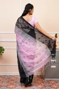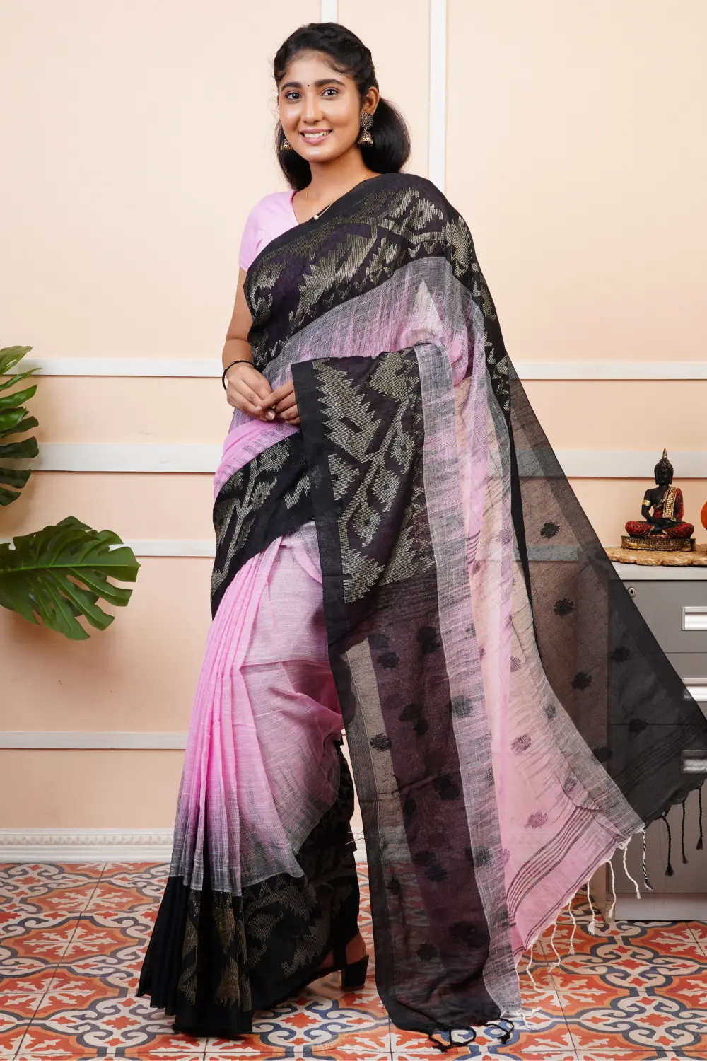 Woven from a blend of linen and cotton, this Korat saree delivers breathable comfort and a refined texture, making it an elegant choice for everyday wear and special gatherings.