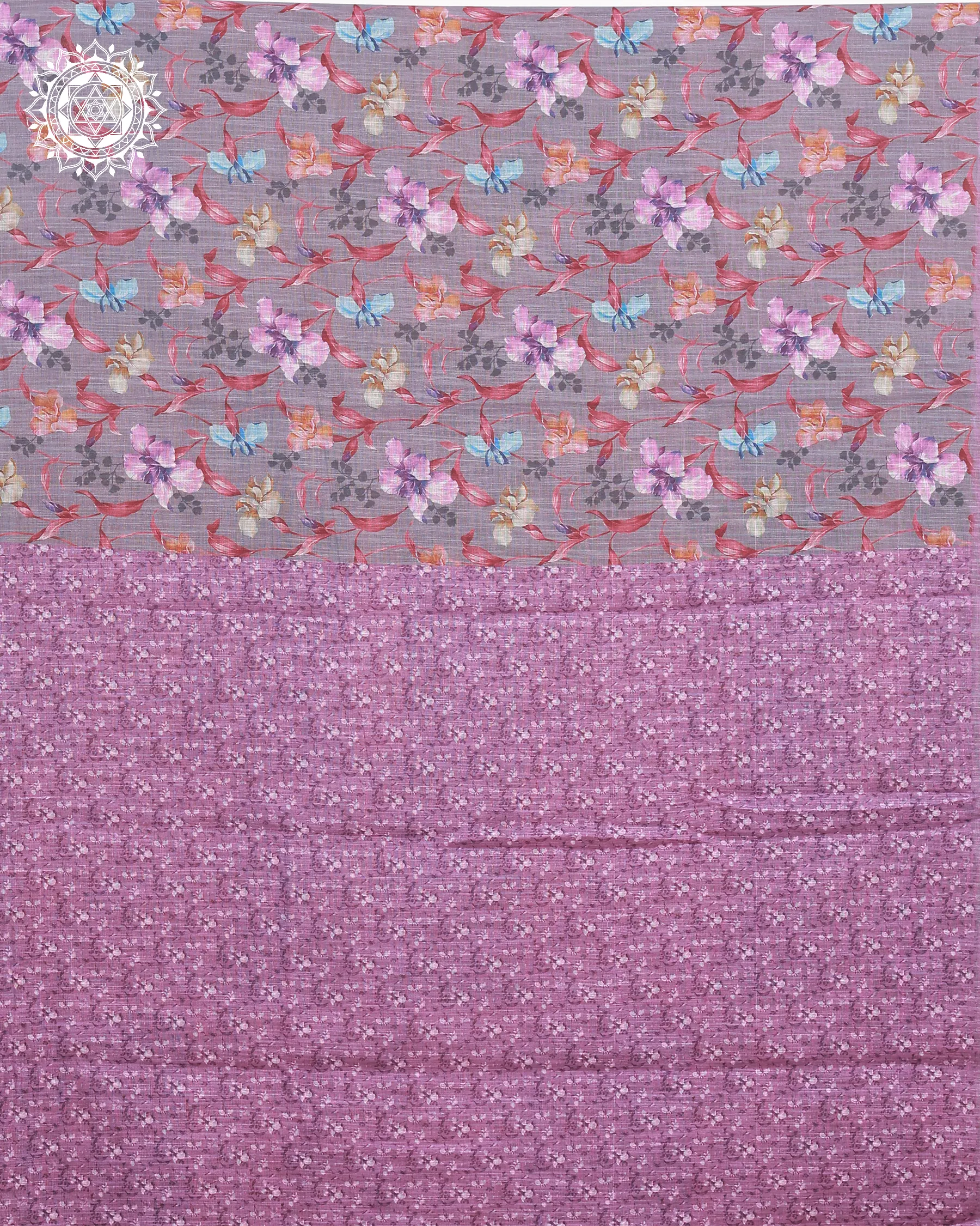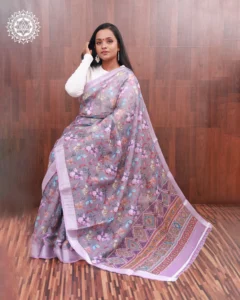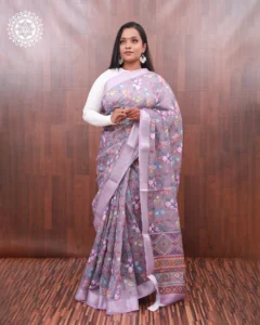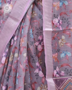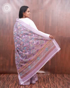 A charming blend of soft florals and intricate geometric border work, this lavender cotton saree brings elegance and artistry together. Ideal for casual gatherings or cultural occasions with a touch of grace.