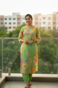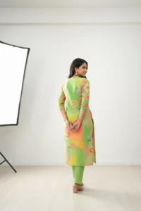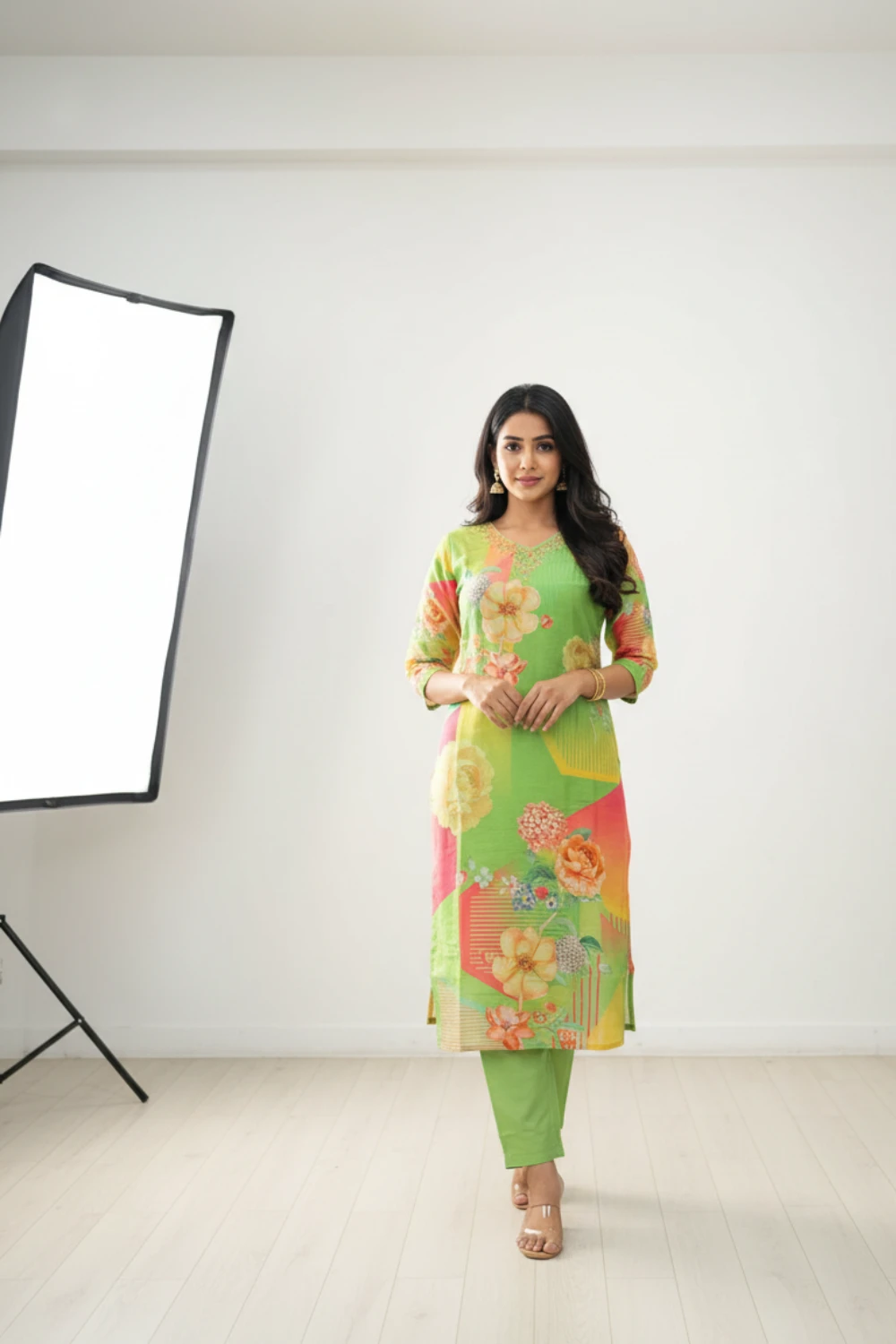 Bright lime green straight kurta with vibrant digital floral print, detailed neckline, and solid coordinated pants.