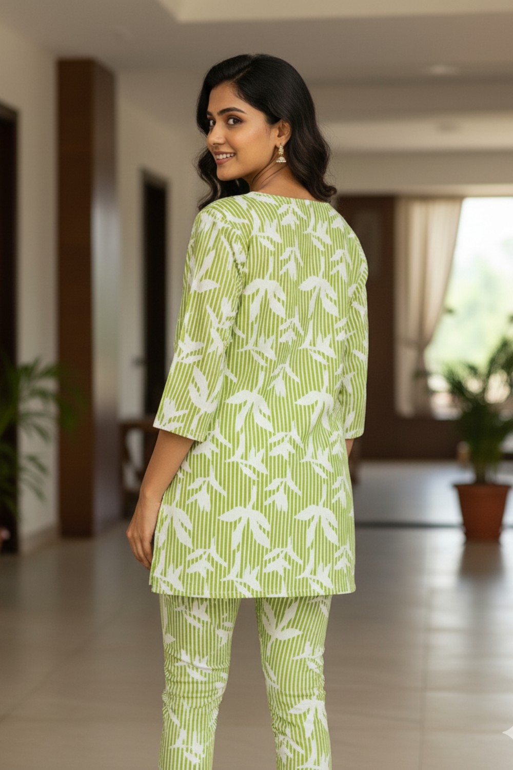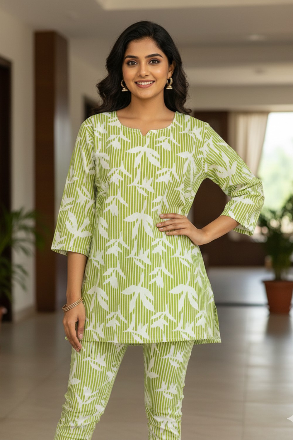 A fresh cotton co-ord set featuring a lively lime green leaf and stripe print on a short tunic and matching trousers.