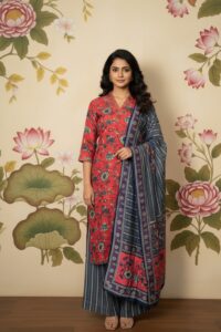 A luxurious Modal Muslin suit with vibrant digital print, enhanced by intricate Tagai threadwork and shimmering sequin details.