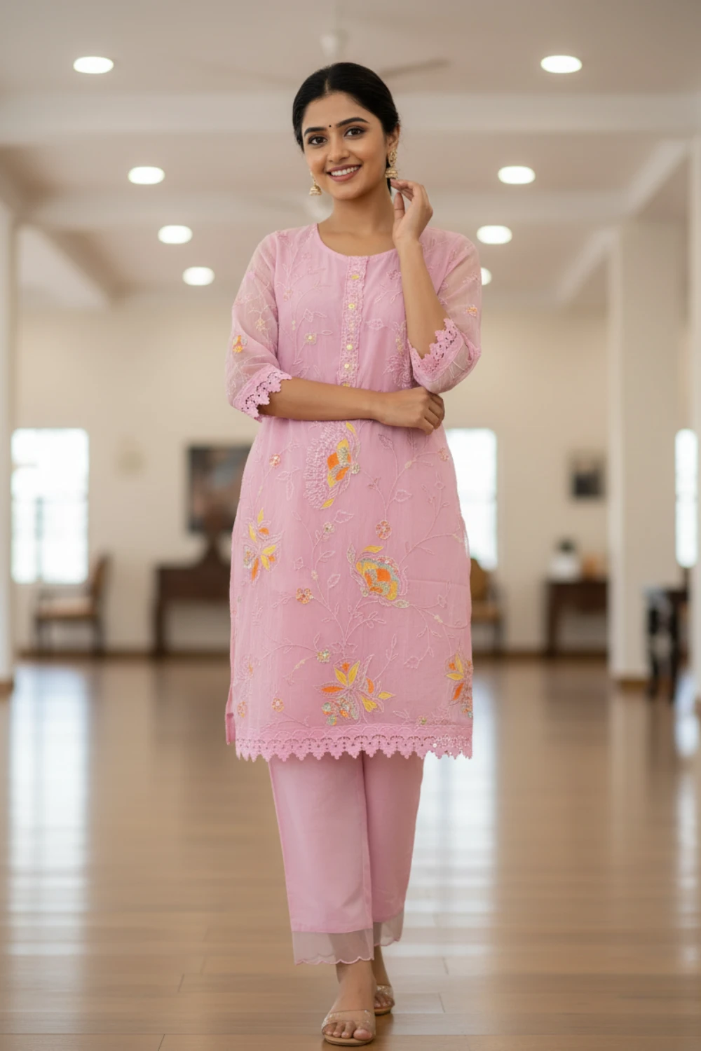 | Work & Details | All-over floral thread embroidery (yellow/orange/pink tones). Kurta features a sheer finish, delicate lace/scallop trim on the hem, and button detailing. |