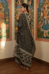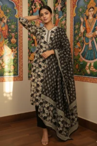 A stylish black and white cotton suit featuring a delicate floral print, complemented by intricate Croatian lace, embroidery, and foil mirror work.