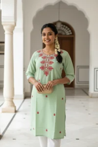 Mint Green Embroidered Cotton Blend Kurta (Top Only)