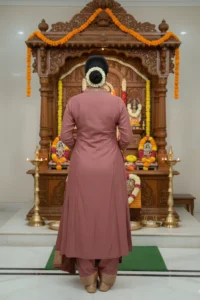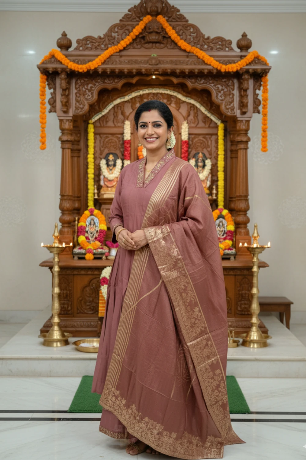 An elegant Anarkali set in pure Mul Chanderi, featuring a sophisticated pattern with full zari heavy detailing on the dupatta, perfect for special occasions.