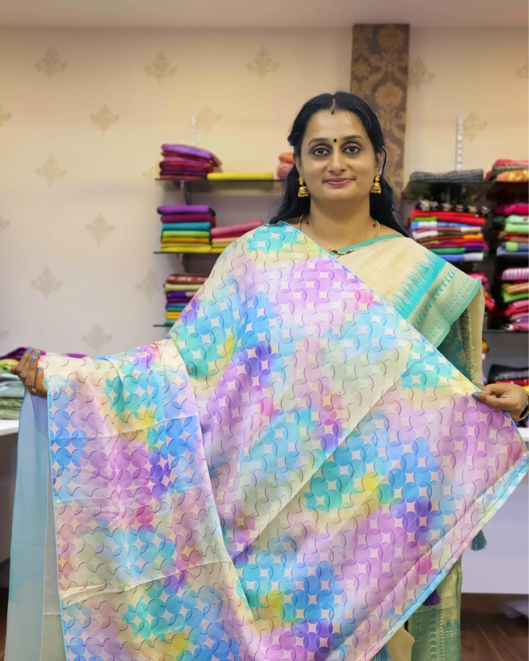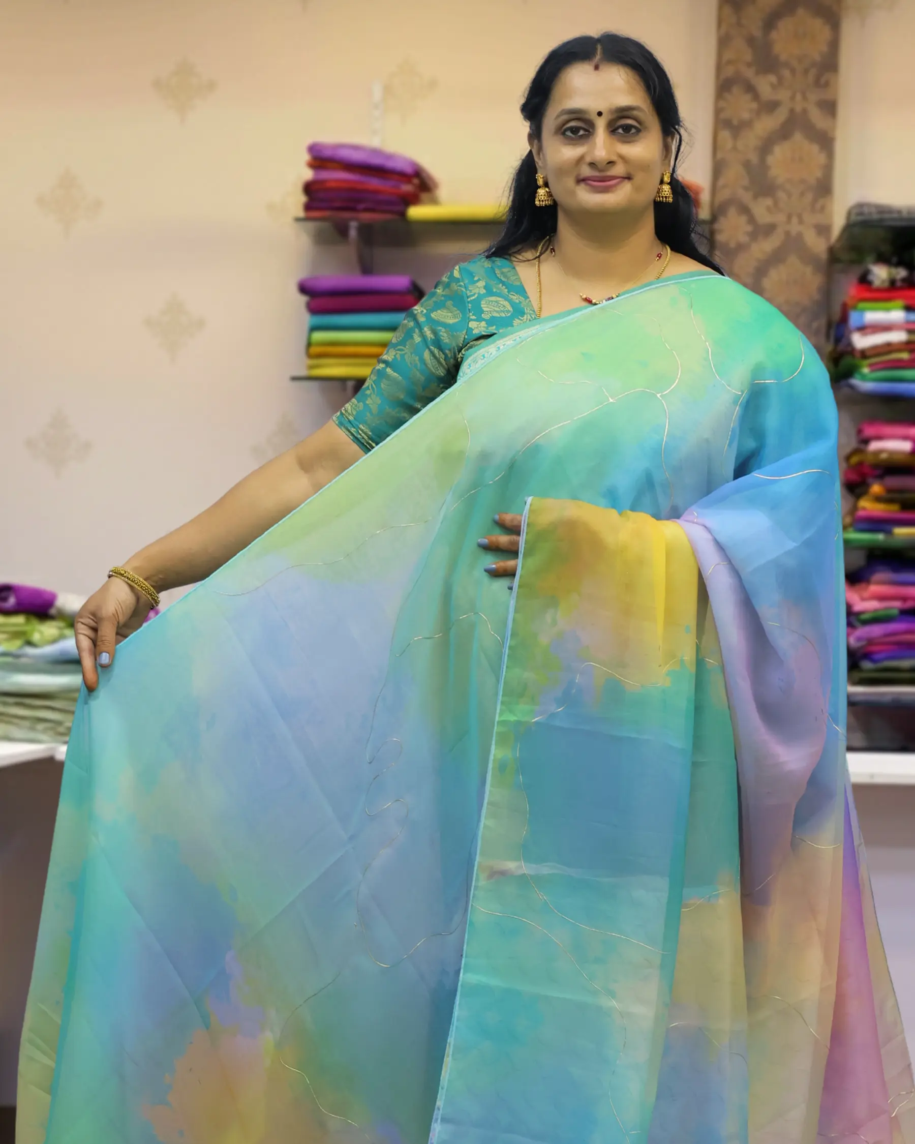 Radiate charm in this Korean Silk Saree, featuring a dreamy pastel rainbow palette. Highlighted by delicate gold gutta outlines and a stylish scalloped border, it offers a lightweight, fluid drape.