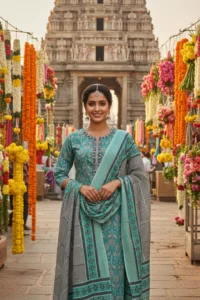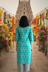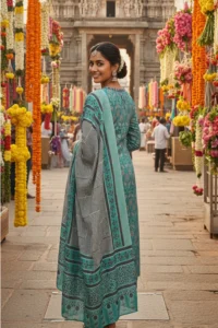 Fabric | Pure Taj Cotton (Kurta and Pants); Kota Doriya or Silk Blend (Dupatta – inferred from visual sheen) |