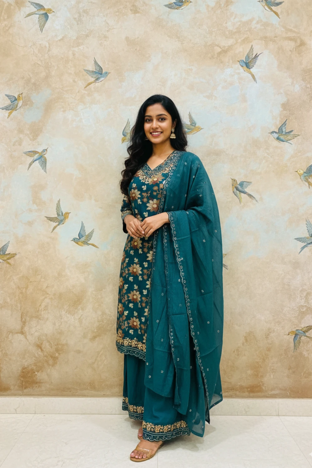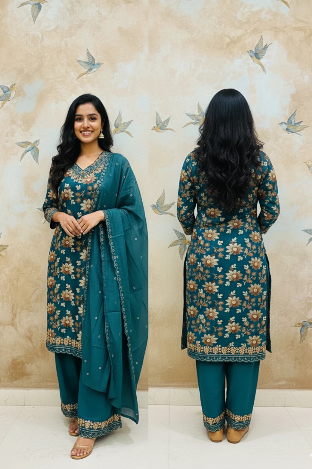 A beautiful peacock green Vertican silk suit set featuring intricate embroidery, sequin and mirror work, paired with a pure cotton dupatta.