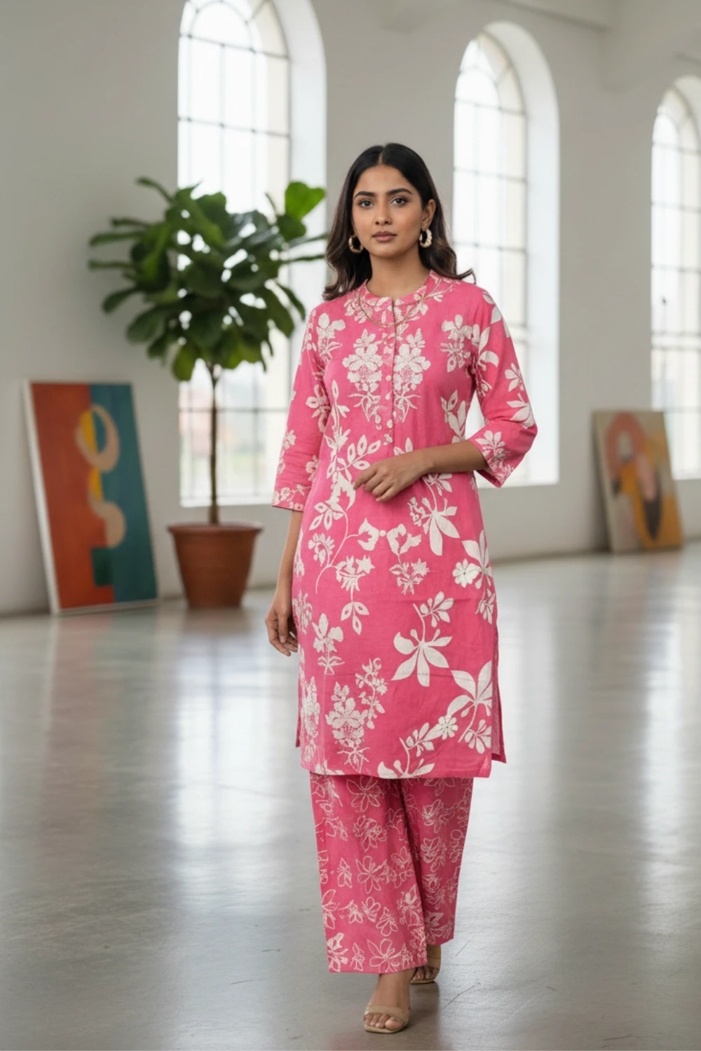 A vibrant pure cotton 60 x 60 suit with all-over floral print, enhanced by delicate embroidery and shimmering mirror work.