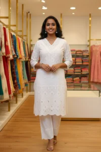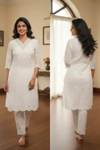 Work & Details | All-over cutwork embroidery (resembling a heavier form of Chikankari) on the body and sleeves. Features a decorative V-neckline yoke and cutwork detailing on the pant cuffs. |