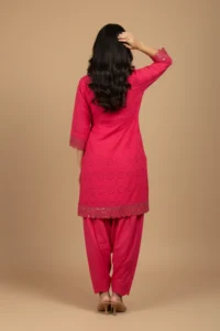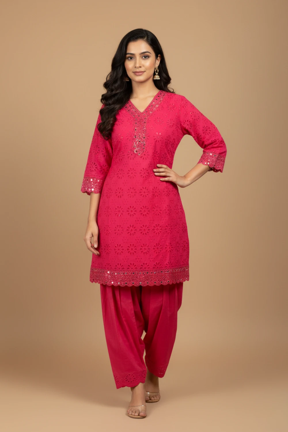 Vibrant rani pink kurta set featuring intricate tone-on-tone chikankari-style embroidery and delicate mirror work detailing.