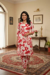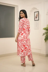 Vibrant cotton blend kurta and pant set featuring a bold red and white abstract print for a modern look.