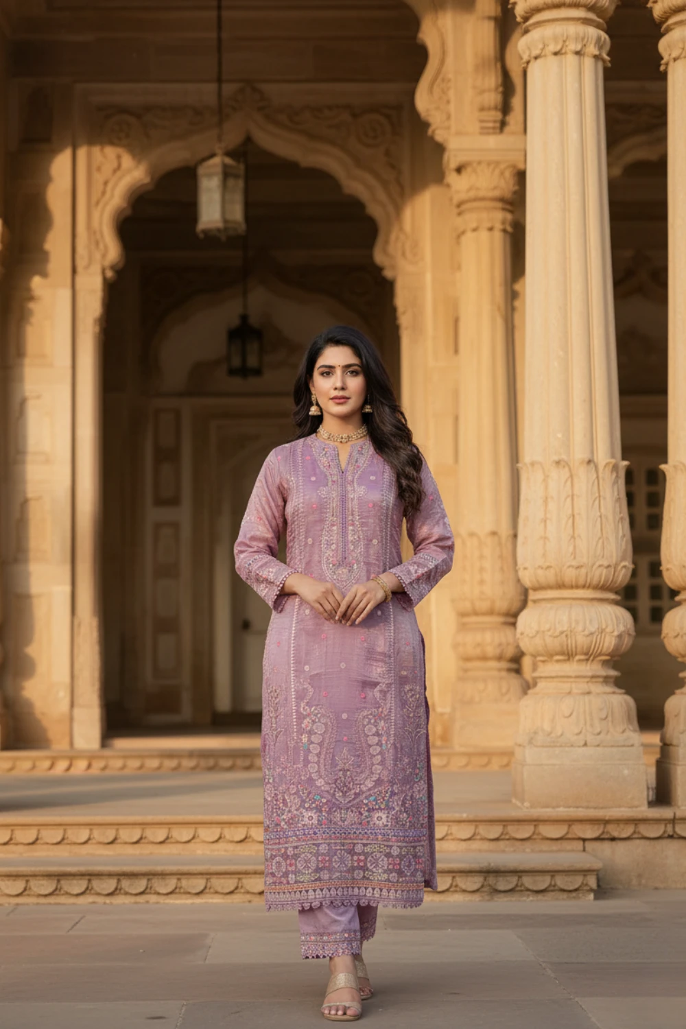 Stunning lilac straight-cut kurta and pants set featuring intricate, heavy tone-on-tone multi-thread embroidery.