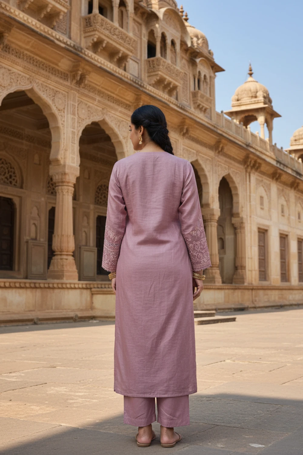 | Style | Straight-fit Kurta with V-Neckline, Full Sleeves, and Coordinated Straight Pants |