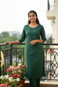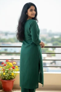 Elegant forest green cotton blend kurta set in a straight fit, offering comfort and timeless simplicity.