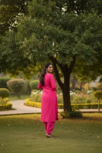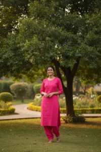 Vibrant fuchsia pink cotton blend kurta set in a comfortable straight fit, perfect for everyday chic