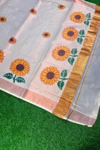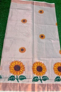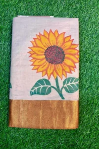 Bright and breezy Kerala cotton saree with sunflower prints, combining traditional comfort with a cheerful modern twist, perfect for casual gatherings, festive wear, or summer celebrations.