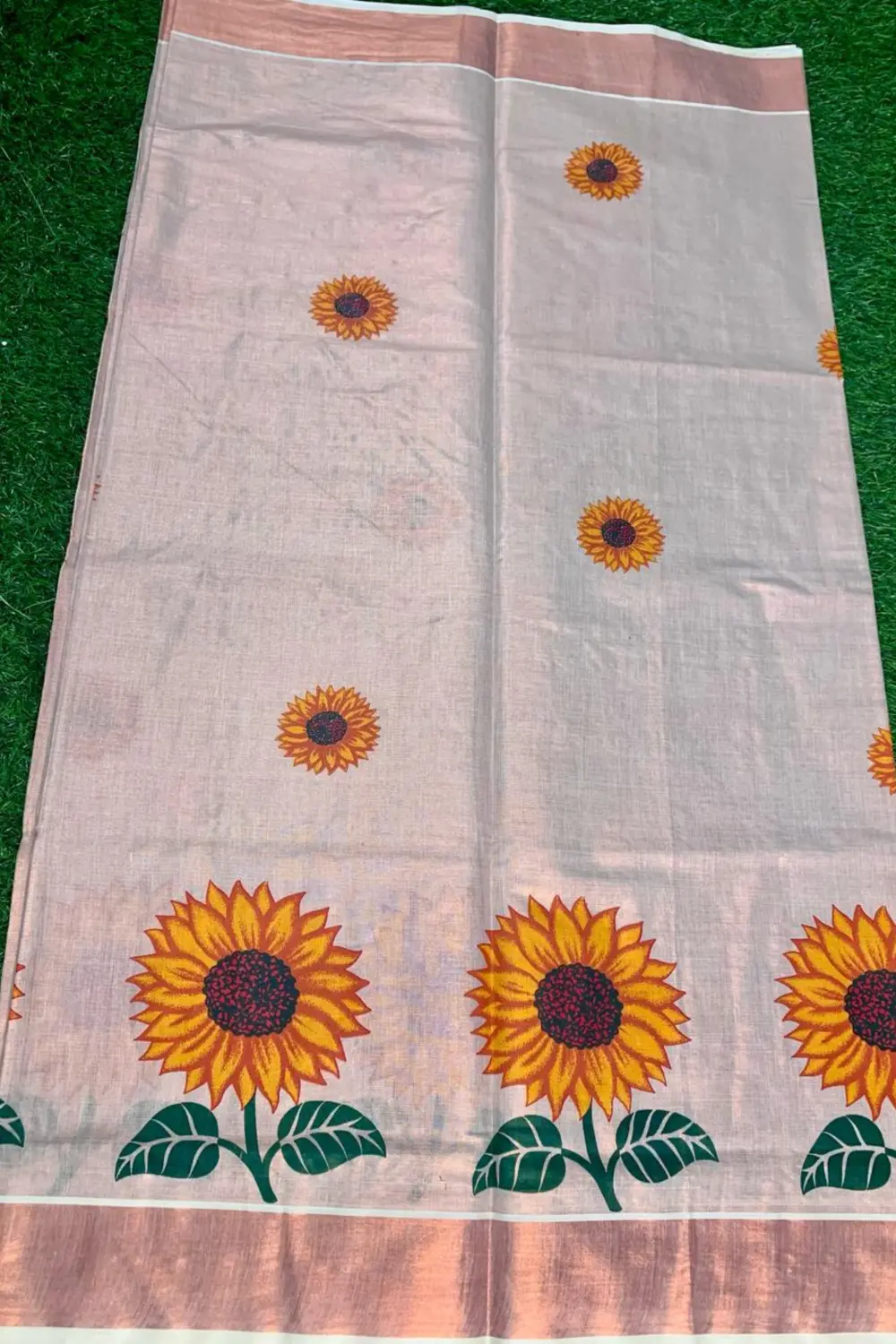 Sunflower Printed Kerala Cotton Saree(Rose Gold).(Blouse wearing by the model is only for sample purpose)
