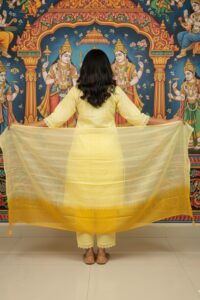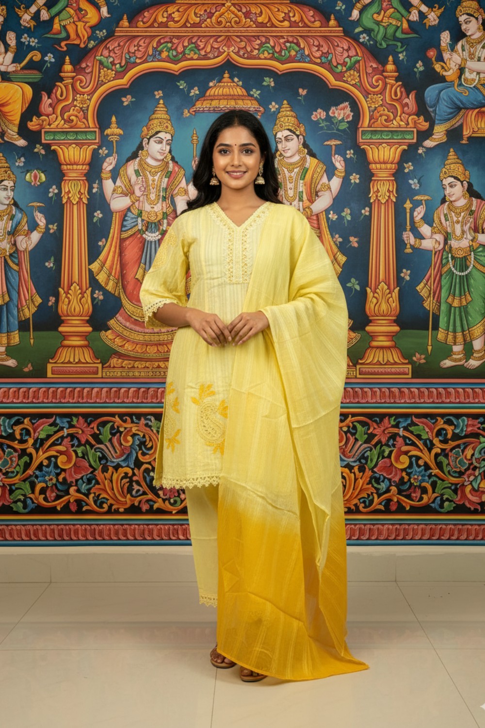 A cheerful yellow Dobby cotton suit with an Anarkali silhouette and unique Kashmiri sleeves. It features beautiful Croatian lace, real mirror, and intricate embroidery work, complete with a dual-toned cotton-crape dupatta.