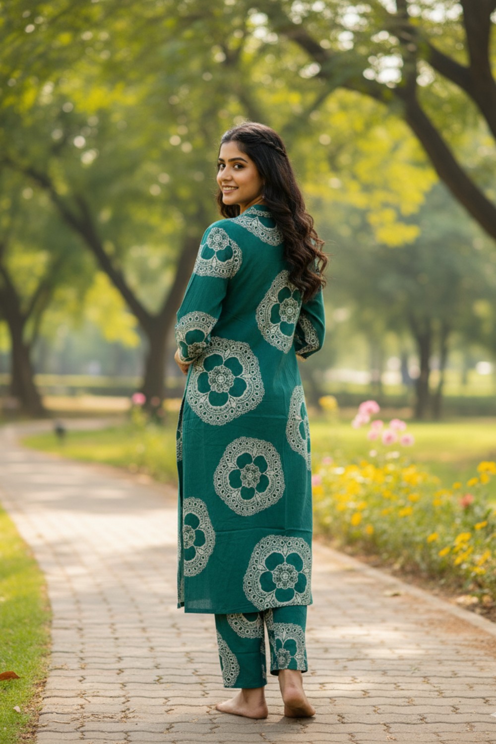 Print & Color | Teal Green with White/Silver Ethnic Motif Print (Foil detailing) |
