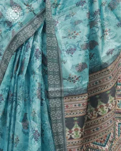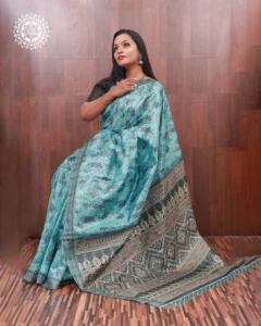 Refined Tussar silk saree with exquisite digital prints, combining tradition and modern style. Lightweight, elegant, and perfect for festive occasions, cultural events, and sophisticated everyday wear.
