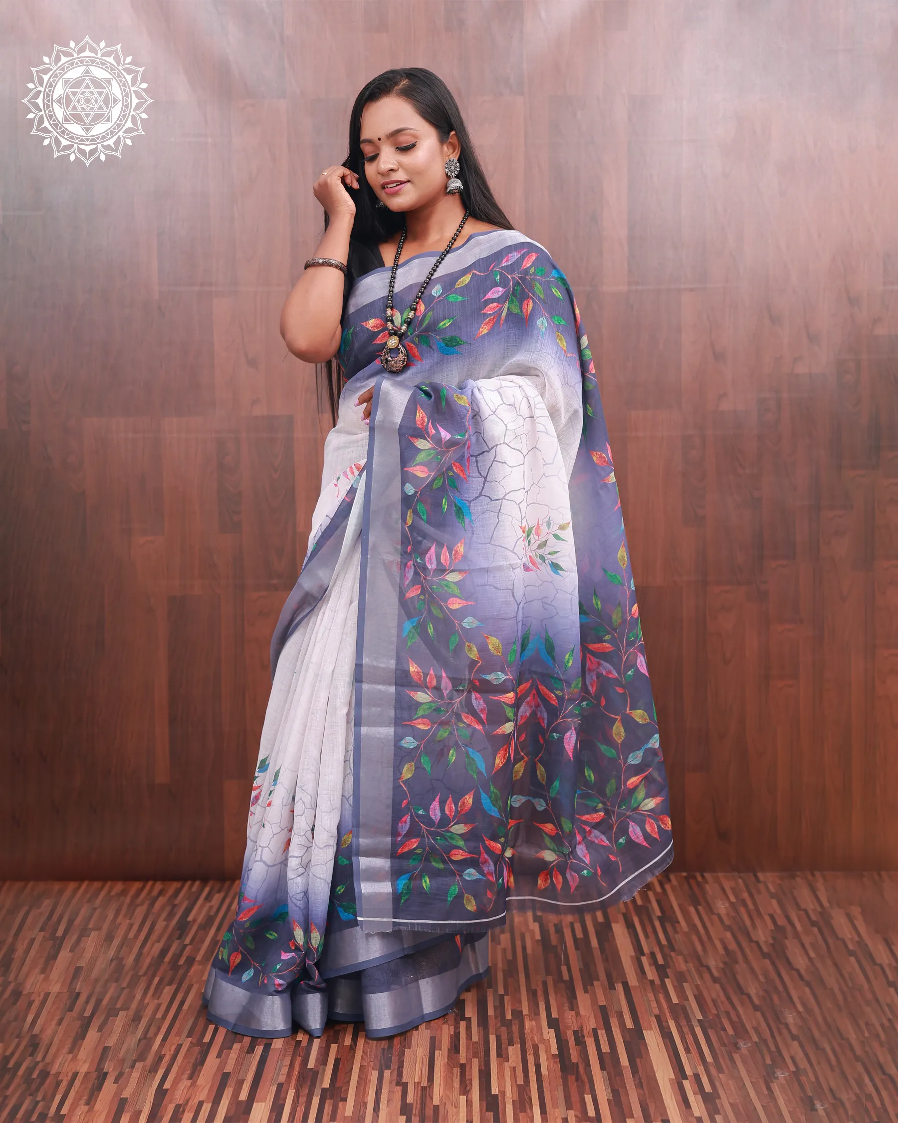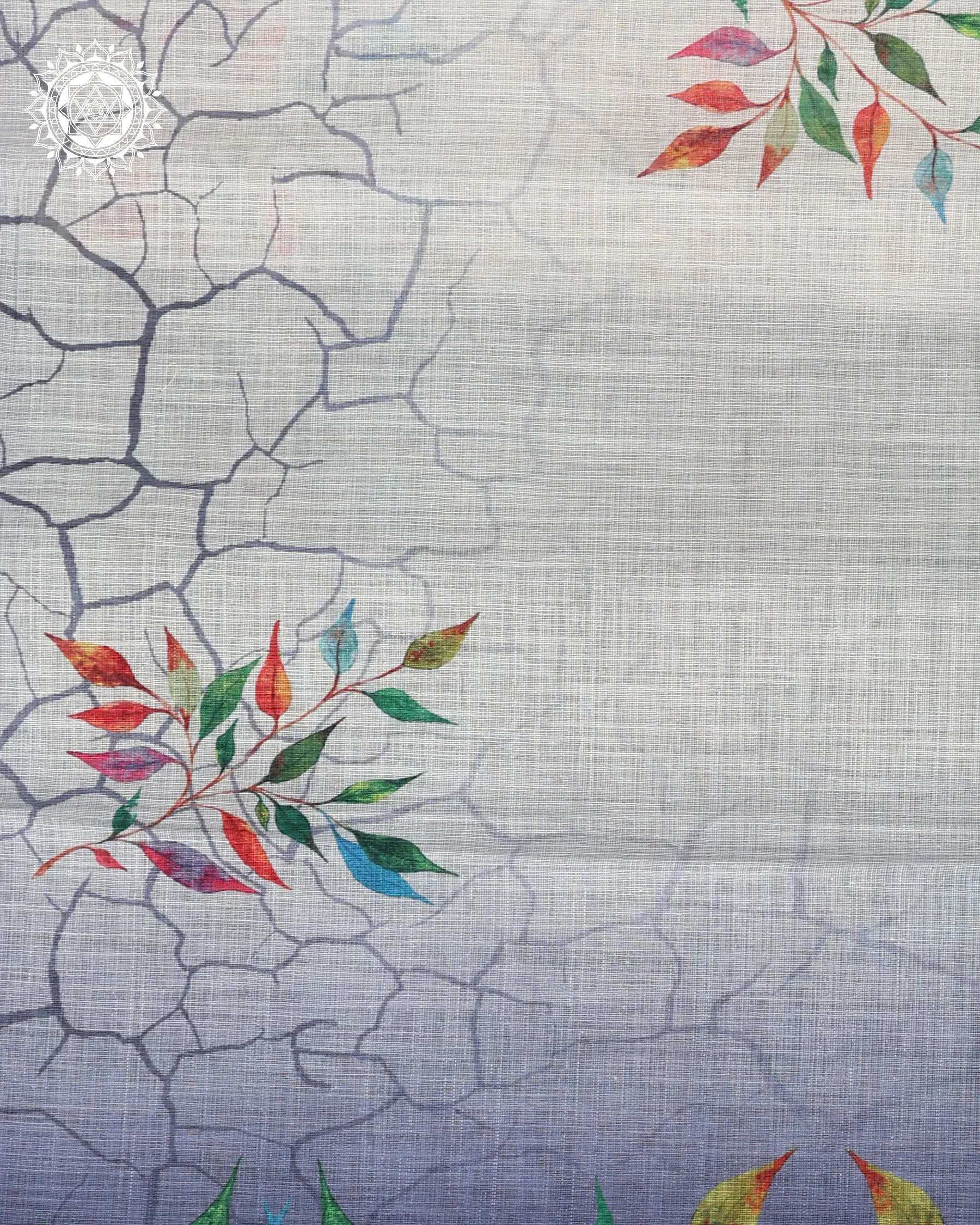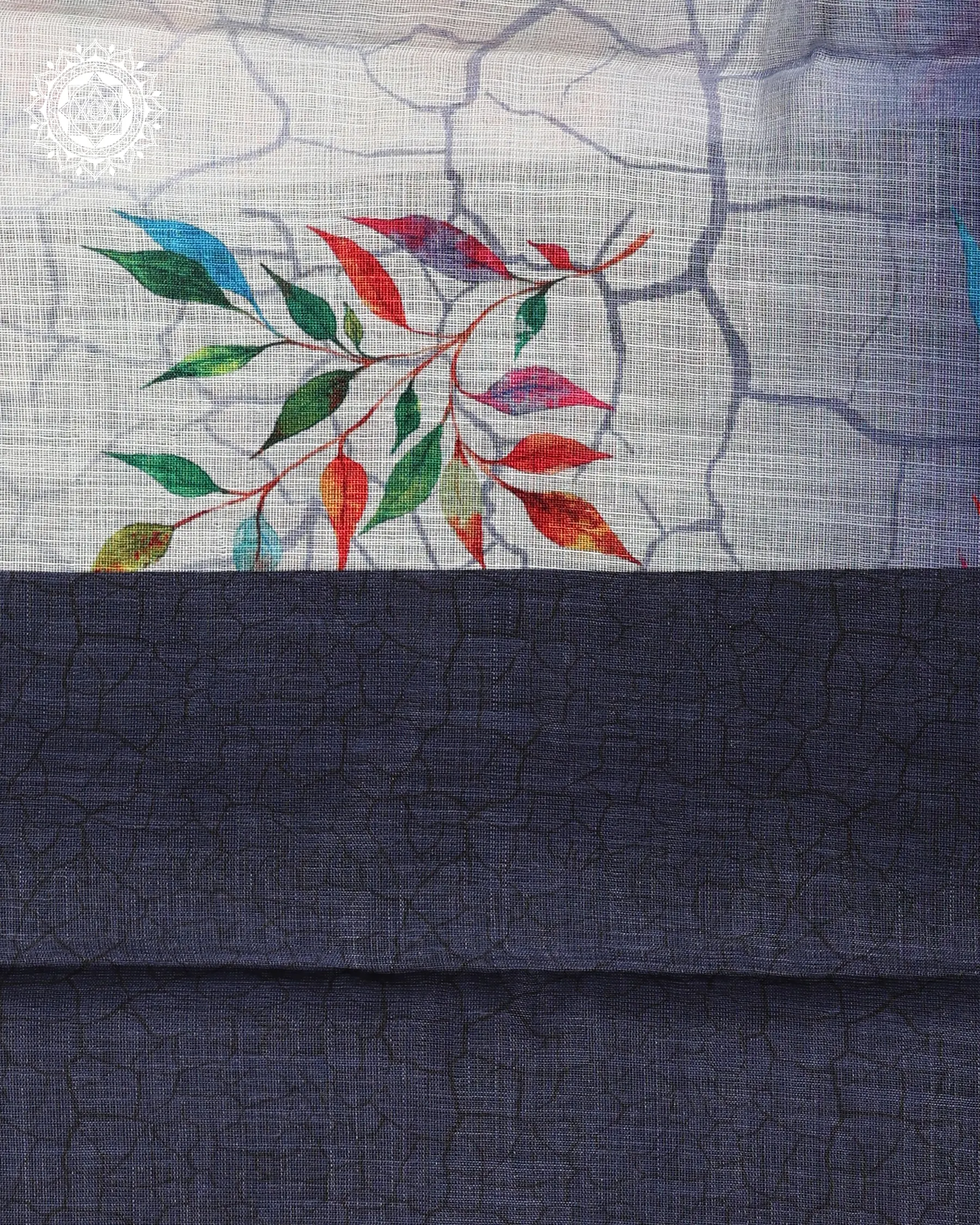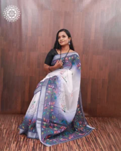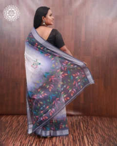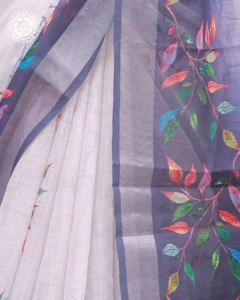 Immerse yourself in the charm of this white and indigo linen-cotton saree, featuring a cascade of colorful leaf motifs and a gradient border. Light, artistic, and graceful — perfect for modern tradition-lovers.